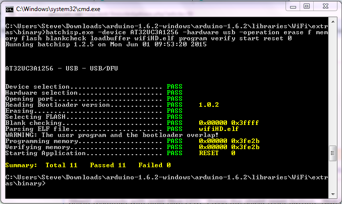 batchisp.exe -device AT32UC3A1256 -hardware usb -operation erase f memory flash blankcheck loadbuffer wifiHD.elf program verify start reset 0